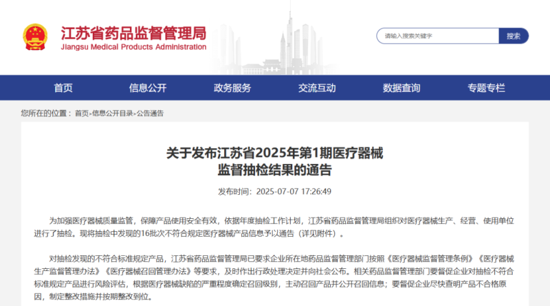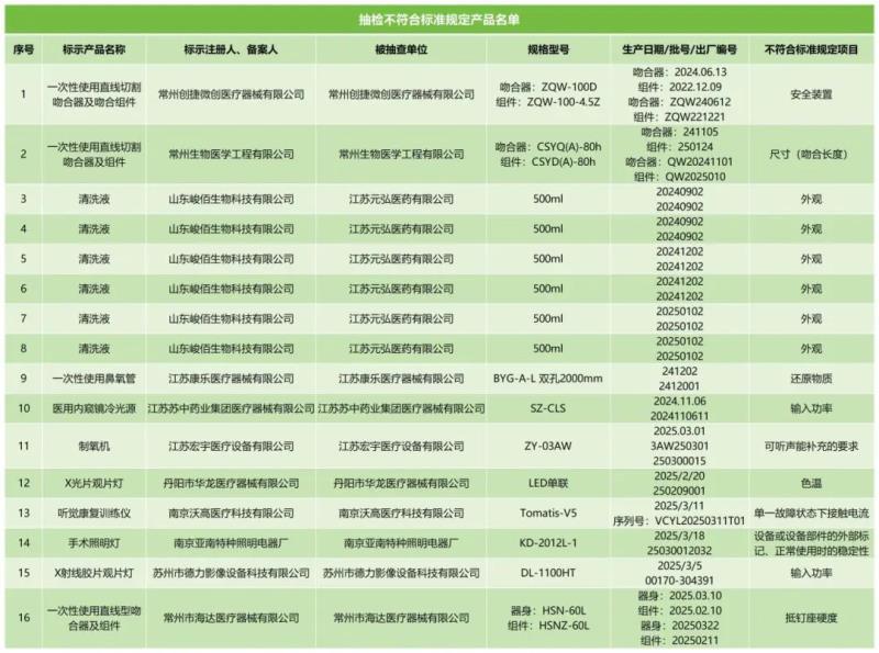 近日,江蘇省藥監(jiān)局發(fā)布《江蘇省2025年第1期醫(yī)療器械監(jiān)督抽檢結(jié)果的通告》,共通告了一次性使用直線切割吻合器及吻合組件一次性使用鼻氧管、制氧機(jī)、聽覺康復(fù)訓(xùn)練儀16批次不符合規(guī)定醫(yī)療器械產(chǎn)品,具體明細(xì)如下: