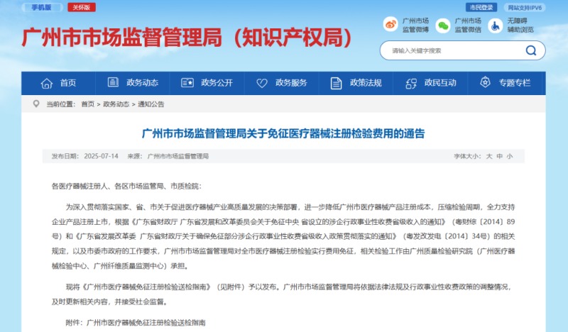 7月14日,廣州市市場監(jiān)督管理局發(fā)布《廣州市醫(yī)療器械免征注冊檢驗(yàn)送檢指南》(以下簡稱《指南》),對全市醫(yī)療器械注冊檢驗(yàn)實(shí)行費(fèi)用免征,相關(guān)檢驗(yàn)工作由廣州質(zhì)量檢驗(yàn)研究院(廣州醫(yī)療器械檢驗(yàn)中心、廣州纖維質(zhì)量監(jiān)測中心)承擔(dān)。