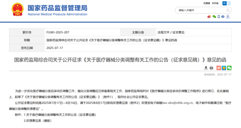 公開征求意見!國家藥監(jiān)局?jǐn)M優(yōu)化醫(yī)療器械分類調(diào)整工作?