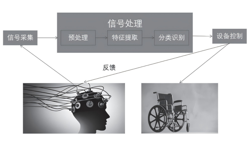 20世紀(jì)70年代初,美國(guó)加州大學(xué)洛杉磯分校的計(jì)算機(jī)科學(xué)教授雅克·維達(dá)爾(Jacques Vidal)首次提出了“腦機(jī)接口”這一名詞 。經(jīng)過(guò)數(shù)十年的發(fā)展,腦機(jī)接口已逐漸成為電腦通信技術(shù)的新種類之一。其基本原理是,人們使用腦機(jī)接口收集腦電信號(hào),利用腦電信號(hào)控制電腦程序。目前,腦機(jī)接口技術(shù)已經(jīng)取得了諸多突破并且在多個(gè)領(lǐng)域得到應(yīng)用和推廣,尤其是在康復(fù)醫(yī)學(xué)領(lǐng)域。有研究表明,腦機(jī)接口可通過(guò)患者的運(yùn)動(dòng)想象來(lái)刺激大腦皮層相關(guān)區(qū)域,然后利用收集到的腦電信號(hào)來(lái)啟動(dòng)功能性電刺激,并以此來(lái)刺激受損的肌肉神經(jīng),患者可以利用此電刺激主動(dòng)參與發(fā)力,以達(dá)到改善運(yùn)動(dòng)功能的效果。腦機(jī)接口的工作原理可以分為信號(hào)采集信號(hào)處理、控制設(shè)備反饋 4 個(gè)部分,具體如下。