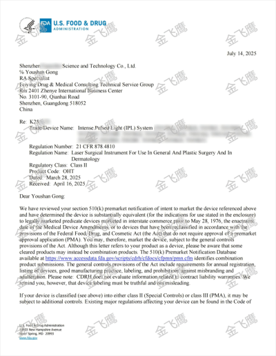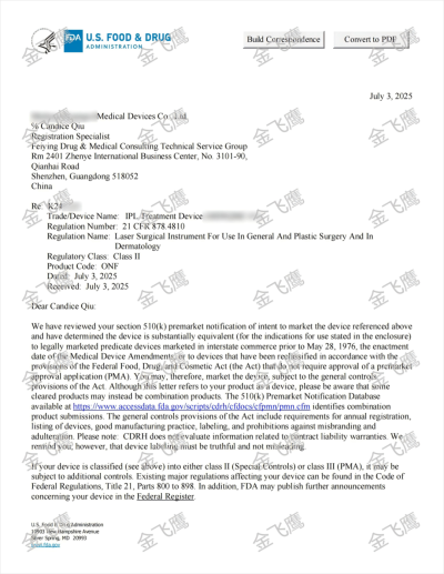 關(guān)注我們的朋友想必已經(jīng)注意到,我們在脫毛儀510(k)注冊領(lǐng)域的成就同樣極為亮眼。由于成功案例實在太多,很多新取得的K號甚至都來不及一一宣傳。值此機(jī)會,我們特別精選兩張今年7月新出的K號與大家分享,更多脫毛儀510(k)成功案例,歡迎點擊右側(cè)鏈接查看?IPL脫毛儀510(k)。