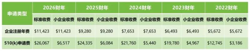 接下來(lái)按我們的老規(guī)矩,我們將近幾年來(lái)的企業(yè)注冊(cè)年費(fèi)和510(k)申請(qǐng)費(fèi)匯總至下方表格,從表格可以看出,這兩項(xiàng)費(fèi)用每年都有上漲,其中510(k)申請(qǐng)費(fèi)(標(biāo)準(zhǔn)收費(fèi))從2022財(cái)年的$12745到2026財(cái)年的$26067,漲幅已超100%;年費(fèi)漲幅也超100%:
