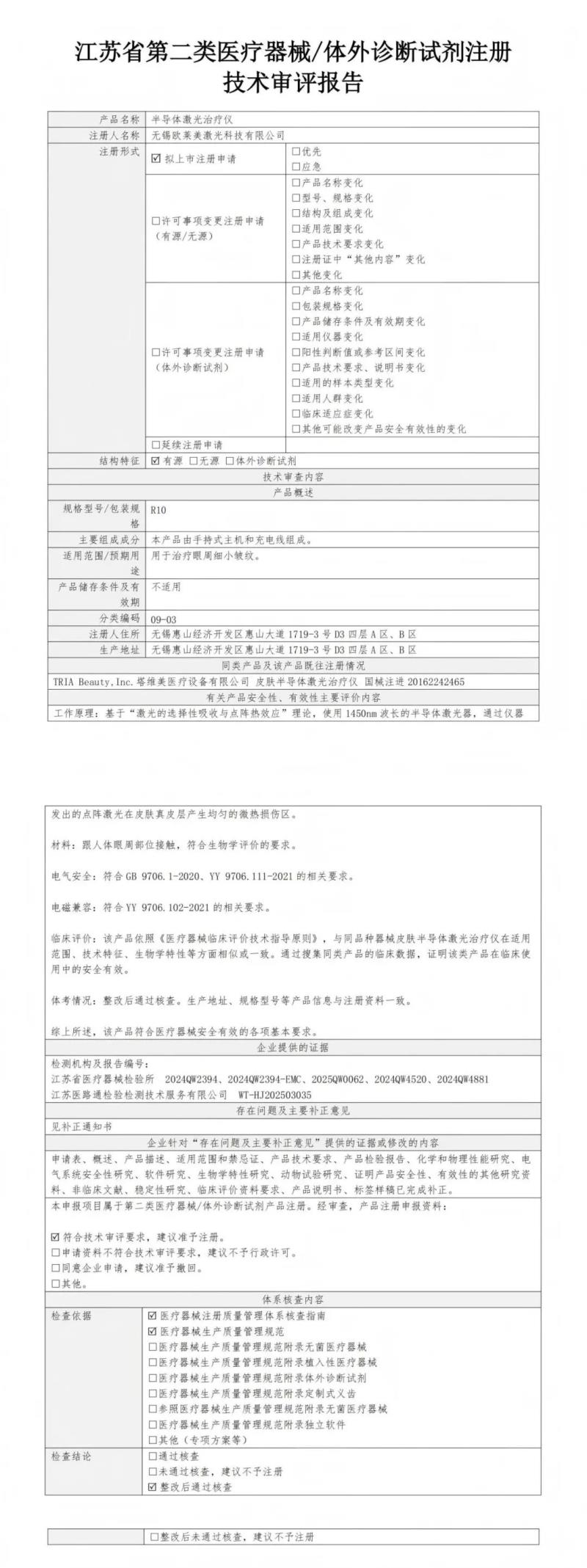8月12日,江蘇省藥監(jiān)局公布了2025年7月批準(zhǔn)注冊(cè)的神經(jīng)肌肉電刺激儀、醫(yī)用分子篩制氧機(jī)、半導(dǎo)體激光治療儀、紅藍(lán)光治療儀、全自動(dòng)沖擊波治療儀、醫(yī)用絲素蛋白凝膠敷料、超聲波治療儀、醫(yī)用重組膠原蛋白液體敷料、醫(yī)用壓縮式霧化器、一次性醫(yī)用激光光纖等136個(gè)醫(yī)療器械產(chǎn)品目錄,同時(shí)隨附了所有產(chǎn)品的技術(shù)審評(píng)報(bào)告,我們將其中“半導(dǎo)體激光治療儀”(預(yù)期用途:用于治療眼周細(xì)小皺紋)的技術(shù)審評(píng)報(bào)告以圖片形式轉(zhuǎn)載如下:
