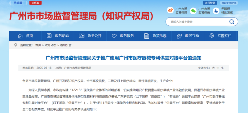 8月18日,廣州市市場監(jiān)督管理局發(fā)布《關(guān)于推廣使用廣州市醫(yī)療器械專利供需對接平臺的通知》(以下簡稱《通知》),《通知》提到,該局依托新型生物材料與高端醫(yī)療器械廣東研究院(以下簡稱“高端院”)“智械云”數(shù)據(jù)平臺建設“廣州市醫(yī)療器械專利供需對接平臺”(以下簡稱“供需平臺”),并于4月11日同步上線微信小程序和PC端。現(xiàn)就平臺推廣使用有關(guān)事項通知如下