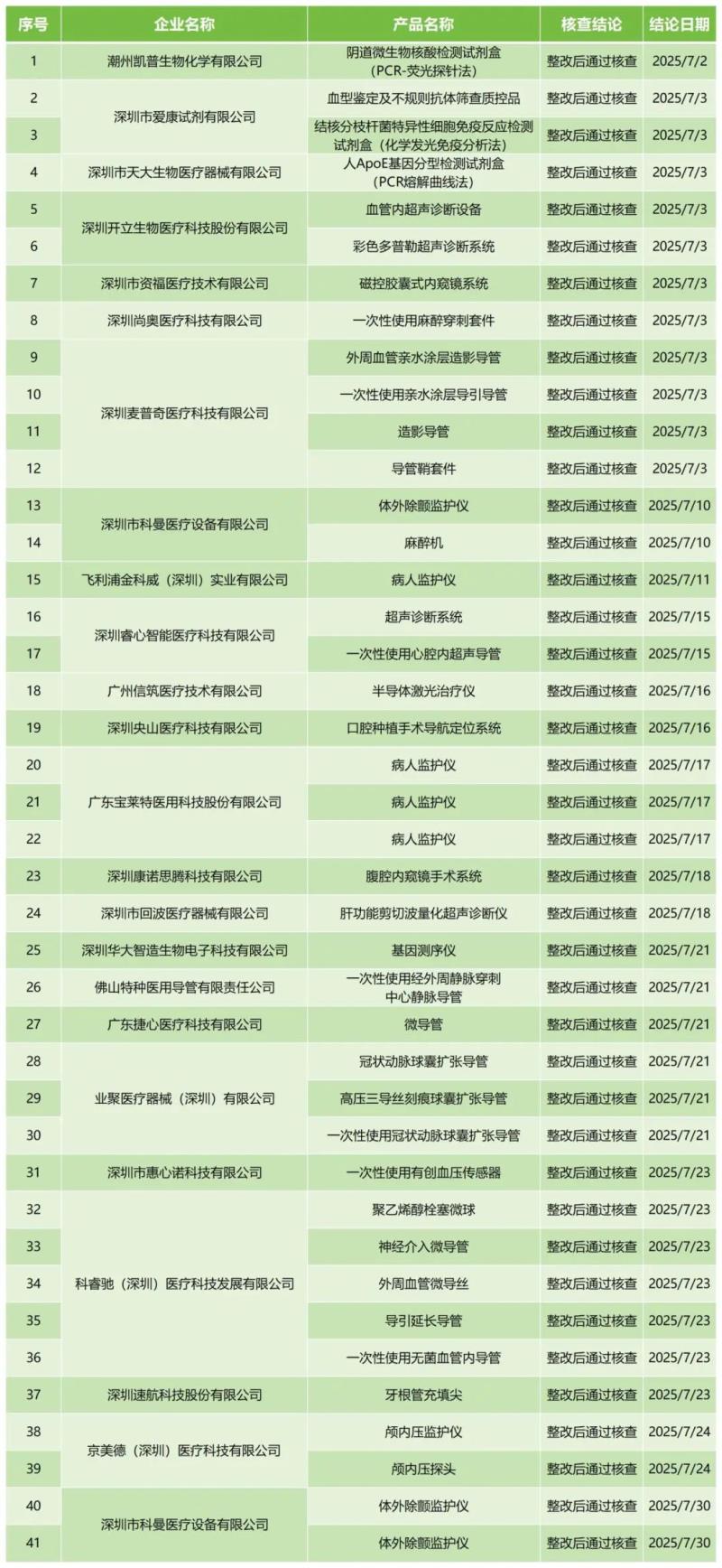 近日,廣東省藥監(jiān)局官網(wǎng)公布2025年7月醫(yī)療器械注冊質(zhì)量管理體系核查結(jié)果,包括深圳市科曼醫(yī)療設(shè)備有限公司的體外除顫監(jiān)護(hù)儀、廣州信筑醫(yī)療技術(shù)有限公司的半導(dǎo)體激光治療儀、廣東寶萊特醫(yī)用科技股份有限公司的病人監(jiān)護(hù)儀、業(yè)聚醫(yī)療器械(深圳)有限公司的冠狀動脈球囊擴(kuò)張導(dǎo)管、科睿馳(深圳)醫(yī)療科技發(fā)展有限公司的一次性使用無菌血管內(nèi)導(dǎo)管等共計41款產(chǎn)品,均為“整改后通過核查”。具體明細(xì)見下方表格: