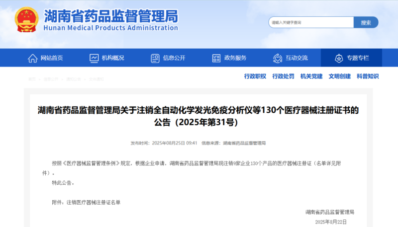 8月25日,湖南省藥監(jiān)局發(fā)布一則醫(yī)療器械注冊(cè)證注銷公告,公告顯示,該局已依法注銷湖南明德醫(yī)療器械有限公司、湖南雷杜生物技術(shù)有限公司、湖南宜樂(lè)芯康生物科技有限公司、長(zhǎng)沙市鵬瑞生物科技有限公司等9家企業(yè)共計(jì)130個(gè)產(chǎn)品的醫(yī)療器械注冊(cè)證,以IVD產(chǎn)品居多,其中湖南明德醫(yī)療器械有限公司這一家企業(yè)共注銷了78款產(chǎn)品(含體外診斷設(shè)備及體外診斷試劑),其他企業(yè)注銷的產(chǎn)品包括醫(yī)用紅外耳溫計(jì)、特定電磁波治療器、掌上彩色多普勒超聲顯像儀等,具體明細(xì)如下: