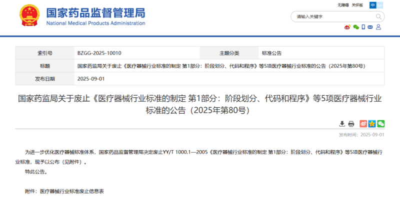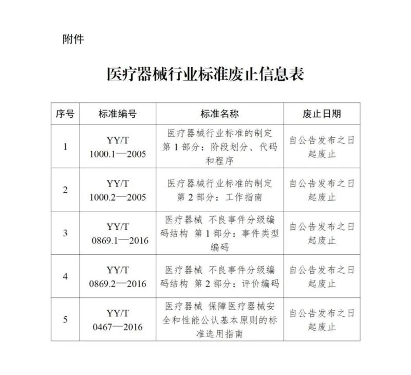9月1日,國(guó)家藥監(jiān)局發(fā)布一則公告稱,該局決定廢止YY/T 1000.1-2005《醫(yī)療器械行業(yè)標(biāo)準(zhǔn)的制定 第1部分:階段劃分、代碼和程序》、YY/T 0869.1-2016《醫(yī)療器械 不良事件分級(jí)編碼結(jié)構(gòu) 第1部分:事件類型編碼》等5項(xiàng)醫(yī)療器械行業(yè)標(biāo)準(zhǔn),具體明細(xì)如下: